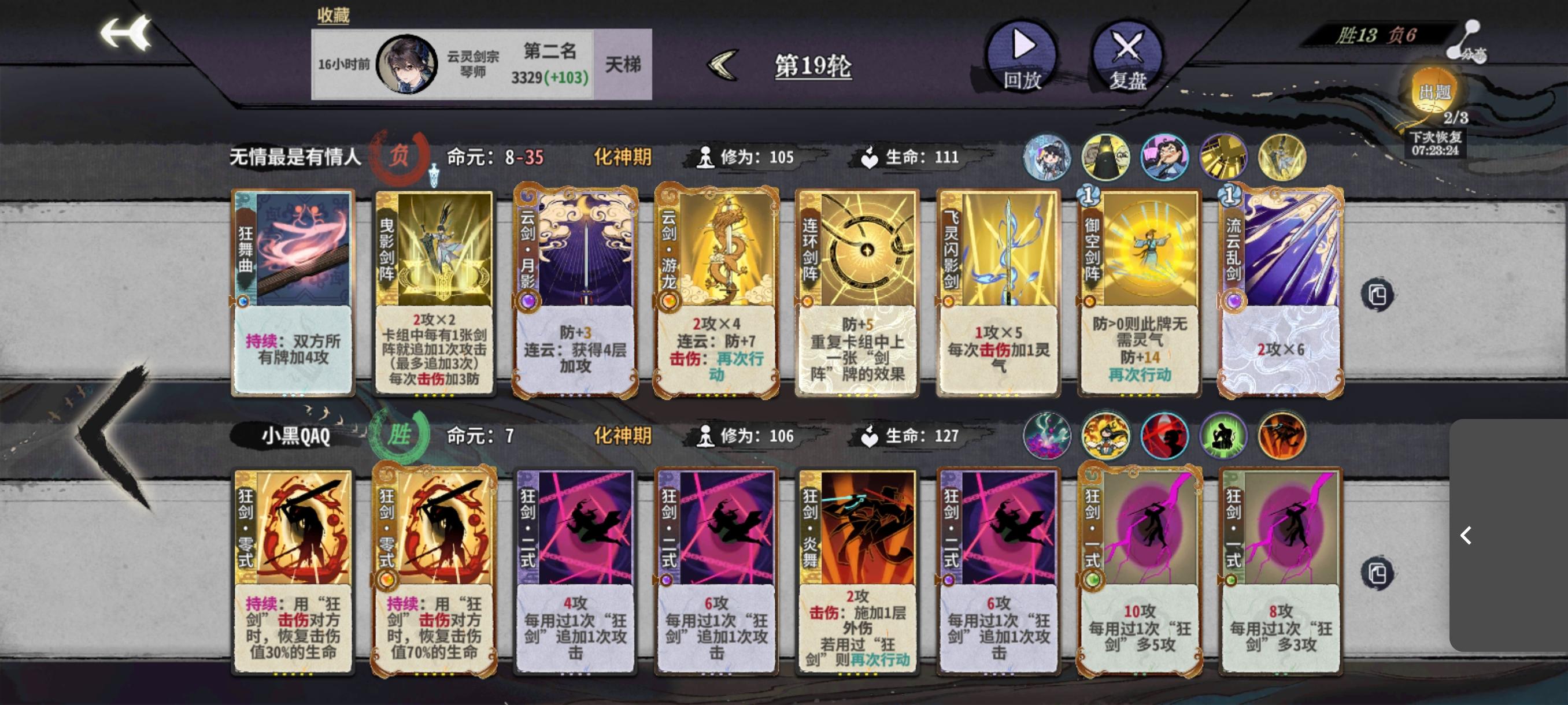 炎雪为人诟病的点,缺D,仙命无法立刻提升战力,导致过度艰难。在追求稳定过度而言,画师大概是最好的选择,因为画的卡组对牌库的污染最少,主打就是多D,加强门派卡,手黑人士的救星[练气期]1~7轮:练气期,建议待到第6-7轮才上金丹1.主要是刷剑意卡组,因为这是化神期前的主要卡组2.建议把练笔刷6张或以上,早刷早享受,一步先,步步先,以免速7速8出局了,发现没有用完练笔3.最后注意科学换牌,因