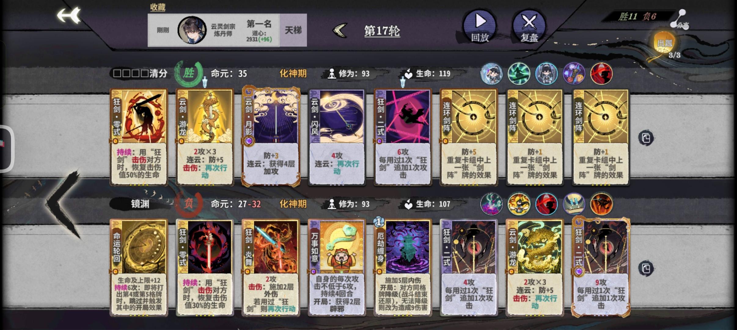 一、前言 熔岩的数值很高,而且是直伤,所以这里写一篇双鸢的攻略。 前几轮不让直接退,就非常无语,打个攻略非得浪费我时间,打得我非常无语,所以这里就随便敷衍一下。二、最终卡组三、过度 纯火过度,点先天火和灵阵来保一下过度,纯火的直伤比内伤高,就算输也不会掉太多血。 然后是是否选化神仙命,化神仙命能让流转合八荒第一圈拿到36防,基本能多出16左右的直伤,而且防速杀能力更强,拿修就没有什么好