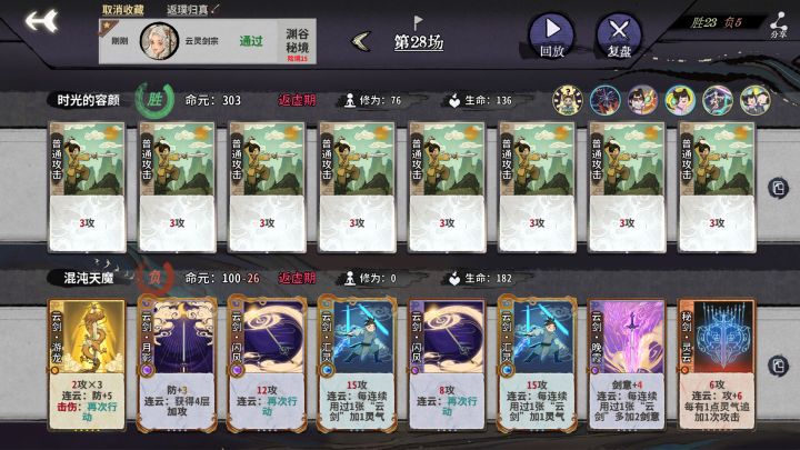 只需要卡练气3回合全d,关键有气韵来一张牌,来体魄牌了必能稳上21,到了金丹再用本命合3级牌,有质量了就可以拿四胜,剩下就交给运气