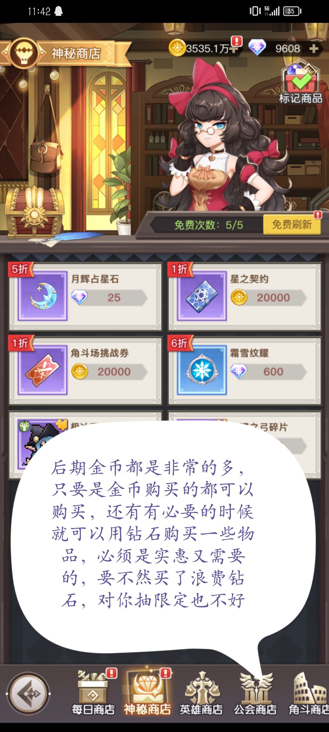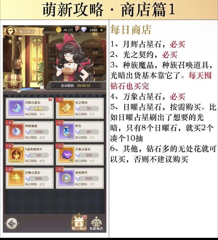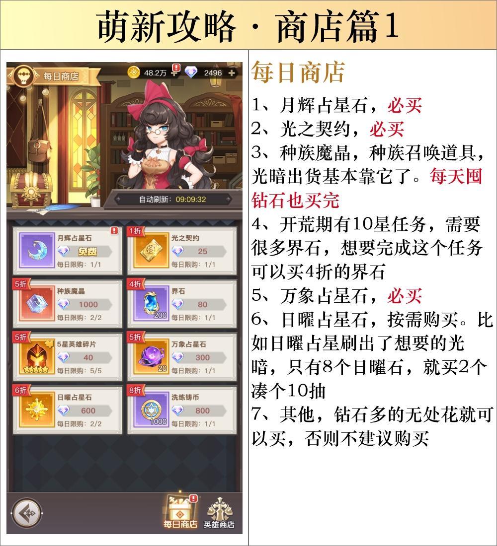 -----------❤️每日商店❤️------------ 月辉占星石、光之契约、界石(零氪界石溢出后可不买)、万象占星石(缺钻可不买) -----------❤️神秘商店❤️------------ (神秘商店右上角可标记商品,请妥善使用) 1. 金币商品「后期」全买(「新号」缺金币可只买角斗场挑战券和星之契约。其他的按需买) 2. 钻石💎商品只买各种界石(溢出后不买)、月辉占星石、种族魔晶
