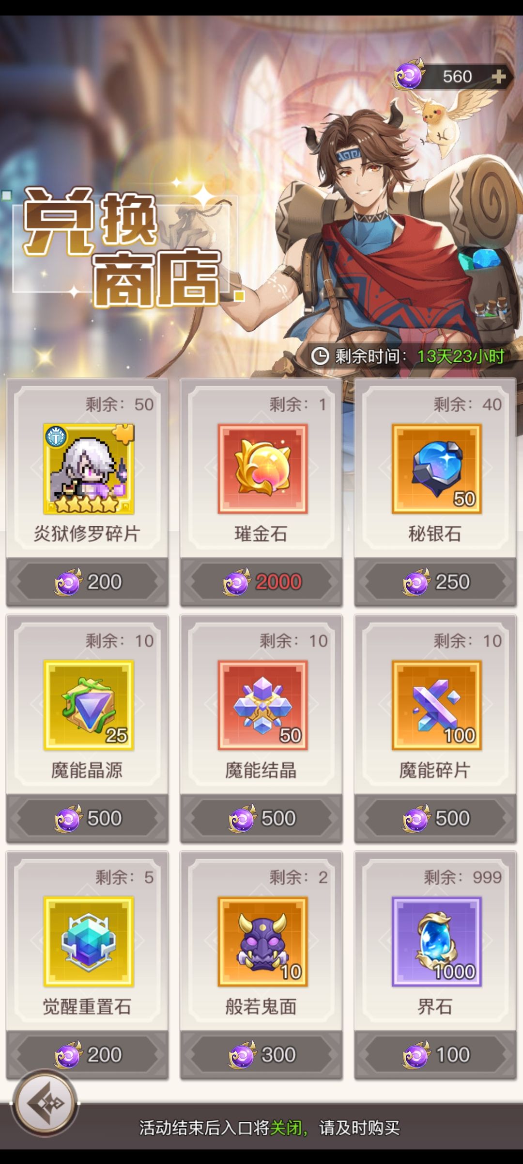 活动的钻石商店分为秘灵,圣武,魔导商每周都有会轮换。 对于白嫖党来说需要买的东西不多。 1 就魔导商店的红碎片在钻石多的情况下可以去买,红秘灵碎片和红圣武碎片我都不推荐购买,在实战里的效果远远没有魔导来的强。 2 还有一些道具是所有商店都有的,比如纹耀徽章,魔能碎片,结晶,晶源,这些都是缺了再去买,不缺的时候不必提前买,钻石会不够用的。 关于角色抽奖方面哪些角色需要抽 1 所有的限定角色,无脑抽,