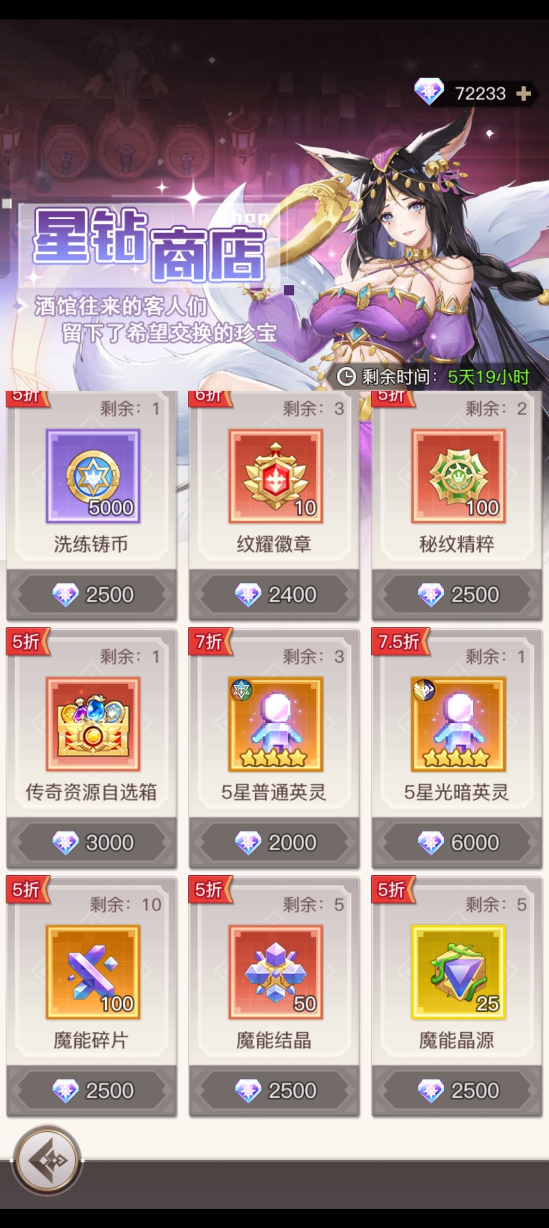 1,英雄召唤里面基本都是狗粮,千万不要用钻石去抽!实在要的话也是去商店刷新买6折的,大富翁里面的也有6折。 2,钻石除了每日拉满花园以外,有买特权的可以拉几次快速战斗追一些等级,低氪的最大目的还是留着抽限时召唤,不管限定还是普通的,至少抽这个是有保底一定拿到想要的! 3,钻石有富裕的,最大性价比是刷新每日商店100次。里面的界石5折的,金币的一些道具,3折的魔晶,等等有需要的东西,都是很划算的。 4