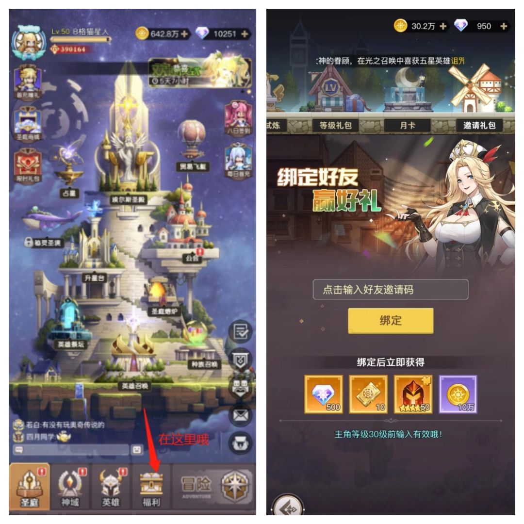 ☞ 一、玩家需知 ①玩家首次注册账号会有邀请好礼提示,要求30级以下输入即可领取 ②一旦玩家等级突破至30级,会自动生成自己的邀请码,并关闭邀请 ③正确打开方式:30级前输入别人的邀请码,30级后邀请别人参与游戏 二、邀请好礼在哪,怎么输入 ①打开游戏界面,找到福利一栏,点击进入 ②从左往右拉到最后一个就是邀请有礼活动 ③如图所示: 三、邀请别人能获得哪些东西,奖励丰厚(奖励如下图所示) 四、如何