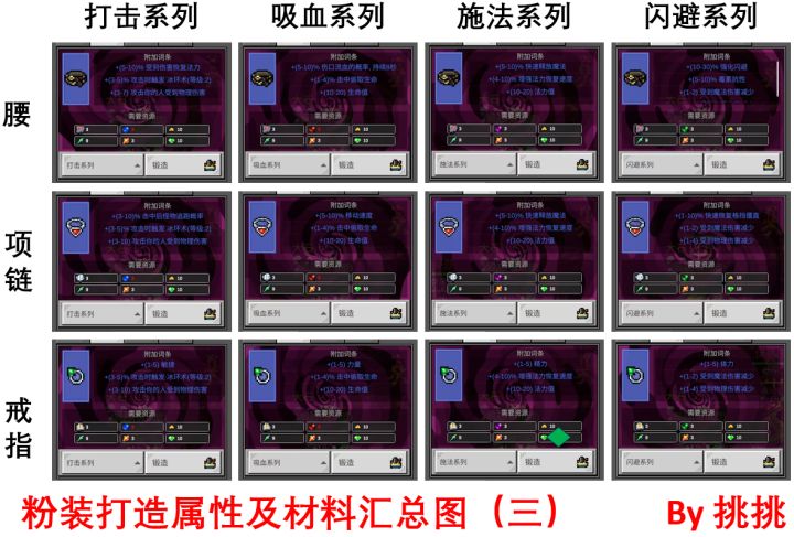 各部位所需秘文如下:武器:3号秘文 x 3盾:5号秘文 x 3头盔:6号秘文 x 3手套:9号秘文 x 3甲:4号秘文 x 3鞋子:8号秘文 x 3腰带:7号秘文 x 3项链:10号秘文 x 3戒指:11号秘文 x 3各系列所需宝石种类如下:打击系列:5阶蓝宝石 x 3吸血系列:5阶红宝石 x 3施法系列:5阶紫宝石 x 3闪避系列:5阶绿宝石 x 3另外每件装备还需