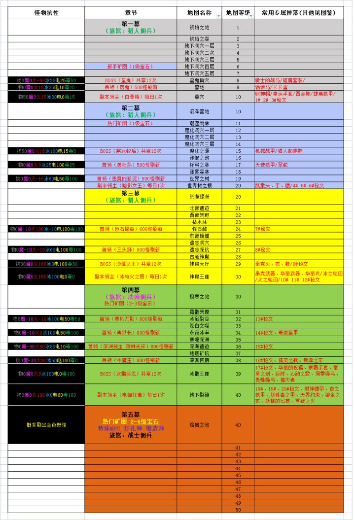 感谢头孢大佬提供的导航图,我在头孢大佬的基础上增加了每个图的怪物种类和抗性,方便萌新过图参考配装,有一些怪物抗性我没打出来,如果有大佬全图鉴了麻烦发一下我好补充完整