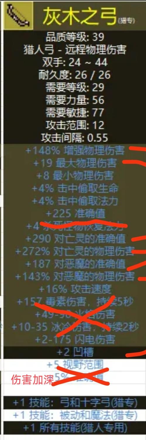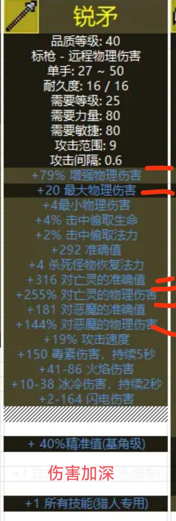 物理系:例如1.弓:增强物理伤害+最大物理伤害+亡灵/恶魔物理伤害(这三个是必须要有的数值越高越好)如果遇到只有亡灵的图就只需要亡灵伤害恶魔同理(后面的boos有的不可以加深如果可以加深的boos就必须带伤害加深伤害翻倍) 其次:双孔>技能 . 攻速 .准确> 吸血吸蓝(亡灵图不能吸)2.标枪:同理比如150物理增强+20物理最大伤害+250亡灵/150恶魔+伤害加深+自修 这种就是极品中