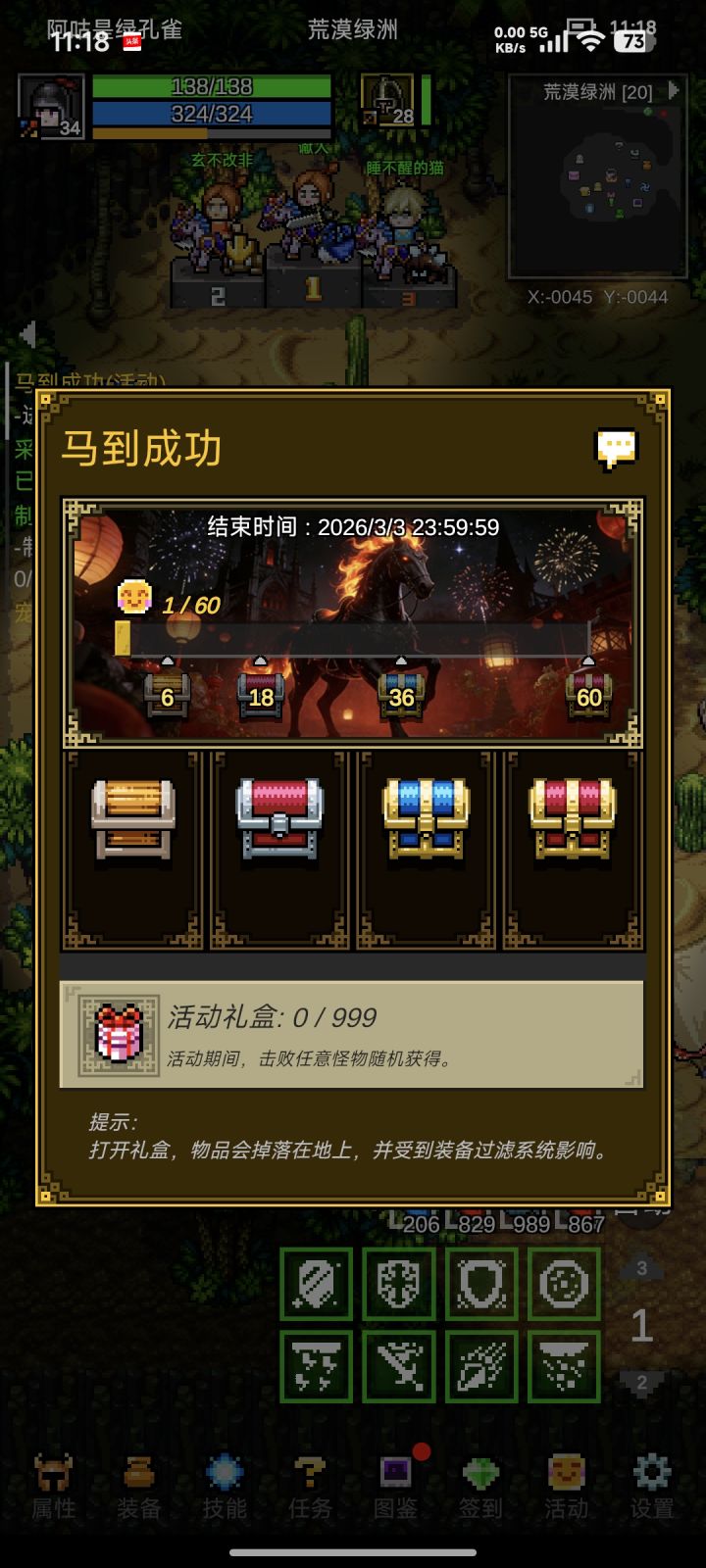 嗨,大家好,给大家拜个早年,祝福大家2026年,开心常乐、马到成功!新年活动内容介绍如下:游戏内容活动如下:【活动时间】2026年2月11日0点-3月3日23点59分【活动内容】1.击杀任意怪物掉落礼盒;签到、完成日常、副本箱子也可以获得礼盒,礼盒中可获得马年限定坐骑。2.签到、完成日常获得活动积分,积累活动积分获得活动宝箱奖励。3.击杀怪物经验翻倍。4.打Boss额外掉落1把金