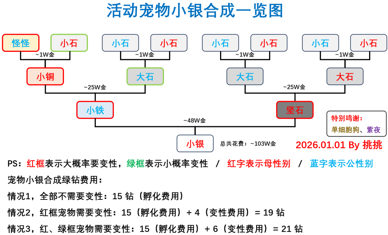 总结了小银的合成一览图,供大家参考。另需要注意,宠物合成对营地幕数有要求!!小铜需要在第二幕及以上的营地才能合成;大石需要在第三幕及以上的营地才能合成;小铁、坚石需要在第四幕及以上的营地才能合成;小银需要在第五幕及以上的营地才能合成。