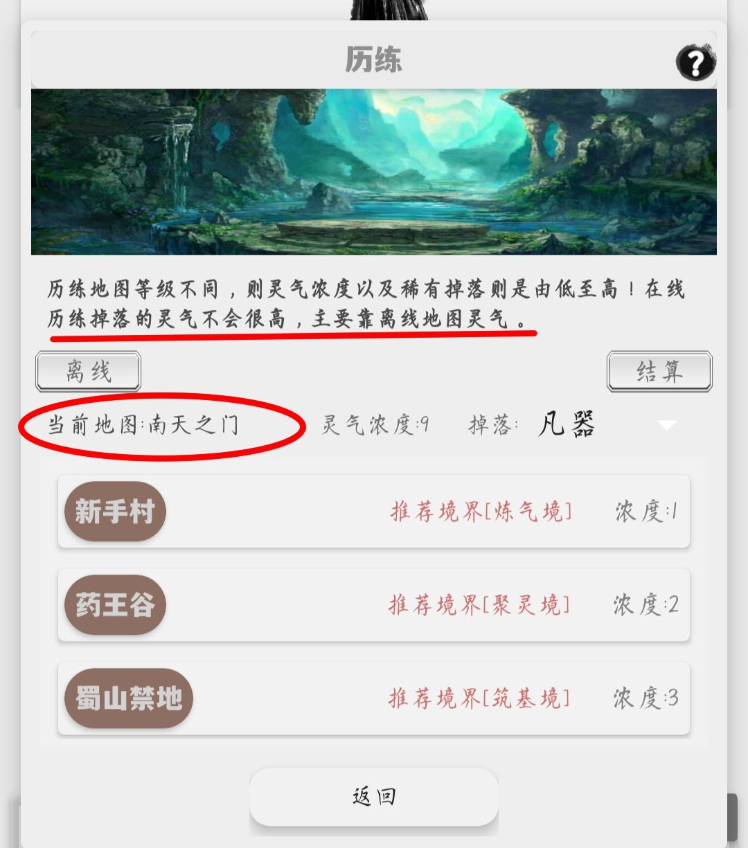 历练有两种:离线挂机与在线挂机。(离线与在线是可以同时进行的,建议先离线再在线挂机) 离线挂机主要获得灵气,以离线下方的当前地图为离线地图。所以想要灵气多,就得保证离线时当前地图为目前战力能进之最高图(例如战力1899,最高能进图二)。 在线挂机主要获得装备和材料。以胜率为判断标准, 一般在99%左右。不需要的装备可以在设置中设置分解,具体参考图二。 胜率怎么看:打开战斗设置,点击开启悬浮窗,左上