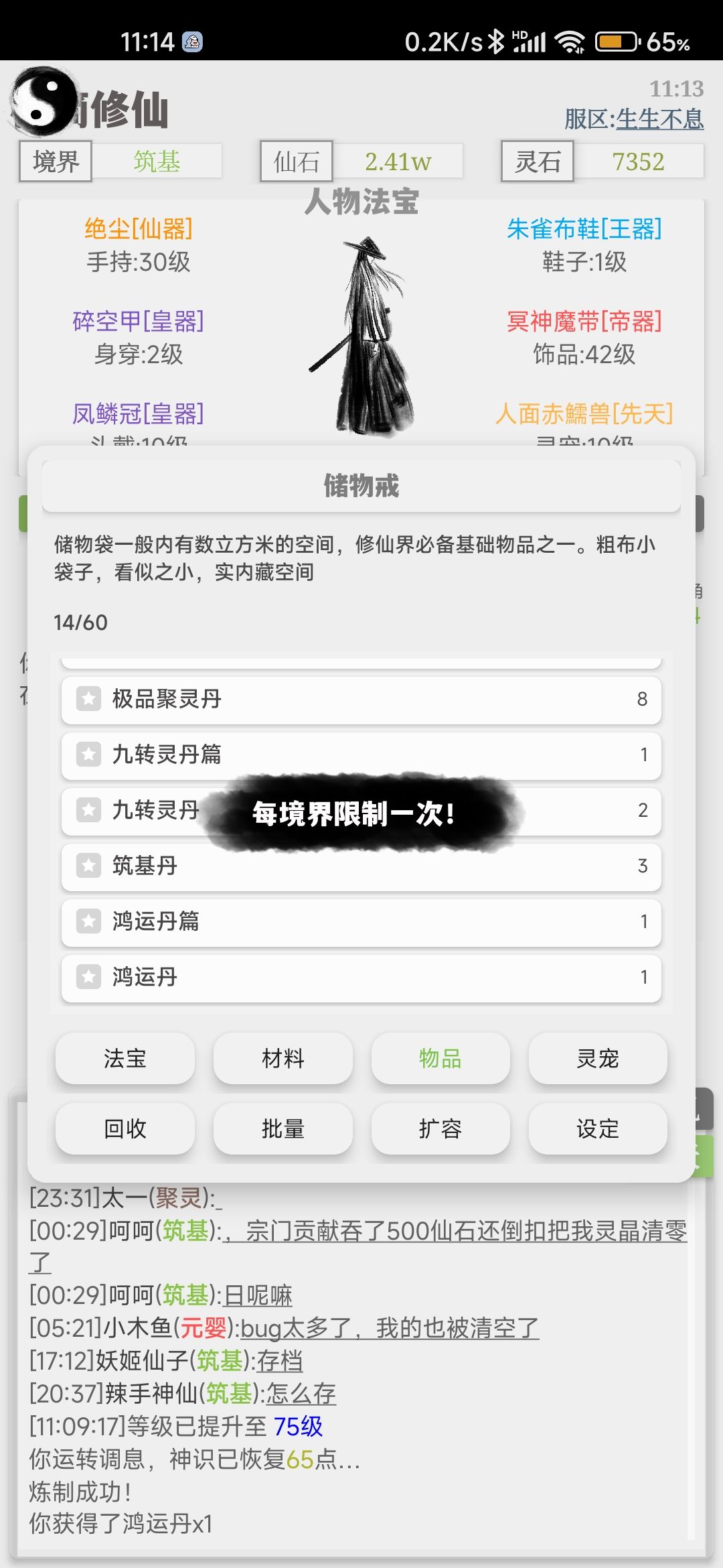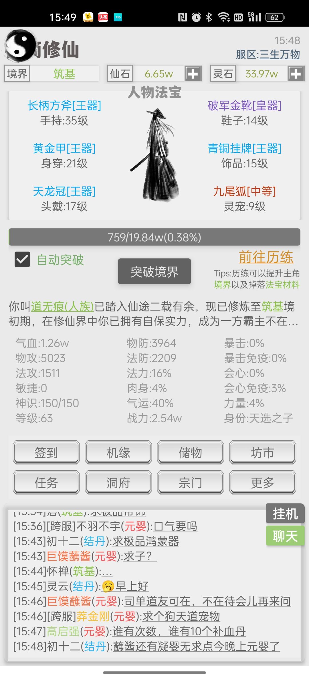 我在这里说一下上面的问题,在第一次签到前,可以跟12区里面大佬要点装备然后打镇妖塔,镇妖塔每天可以打20次,失败不会减次数,打到20层可以到坊市里买扫荡劵,点击扫荡20层,一共有3次机会。无尽试炼里面的怪,打过一次后就可以买扫荡劵,每天每层固定15次。有人可能会问,为什么我灵气满了,但升不了级,在突破小境界时候是要5倍灵气所以突破不了,在化神后(除返虚)都是要天道圣果才能突破小境界。在坊市里装备中
