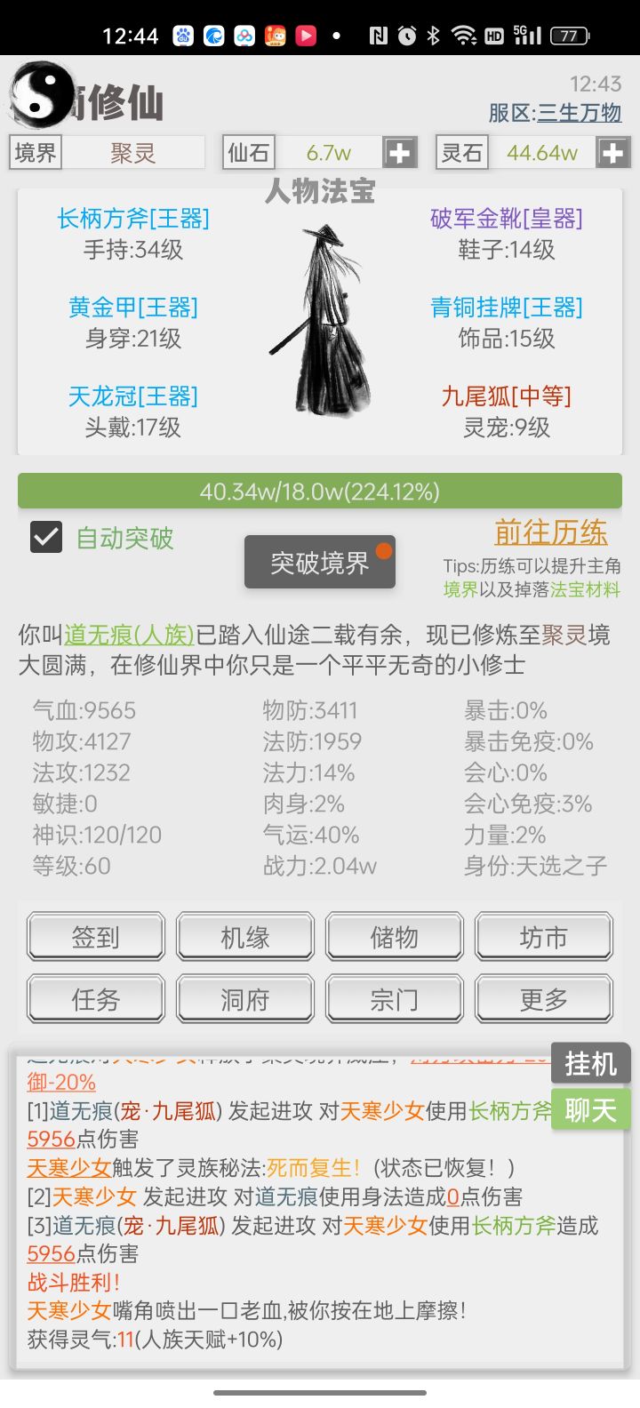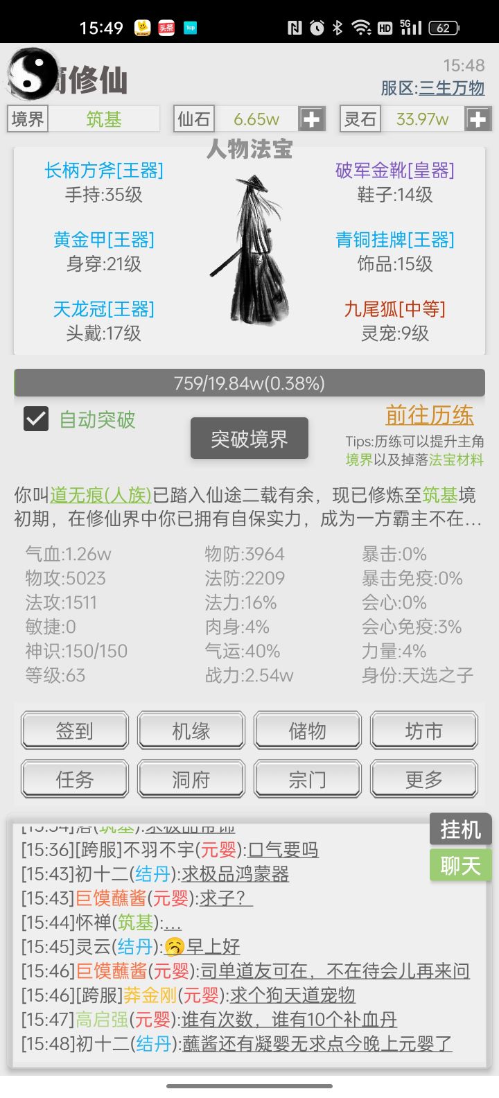 一.新手入坑的话,目前综合下来最好是选择人族,推荐五区或者六区,这两个区目前人比较多,因为有个50w灵气的兑换码没有了,想要快速度过前期的话,可以让大佬多给些装备之类的,很快就可以步入正轨。二.1.进去之后先不要签到,洞府探索找两个聚灵丹(突破用,当然也可以找大佬要),不签到的话可以多做一轮日常,游戏内所有的任务日常都是签到刷新。2.之后先去点历练找到离线,(离线收益是根据你最后一次进入的地
