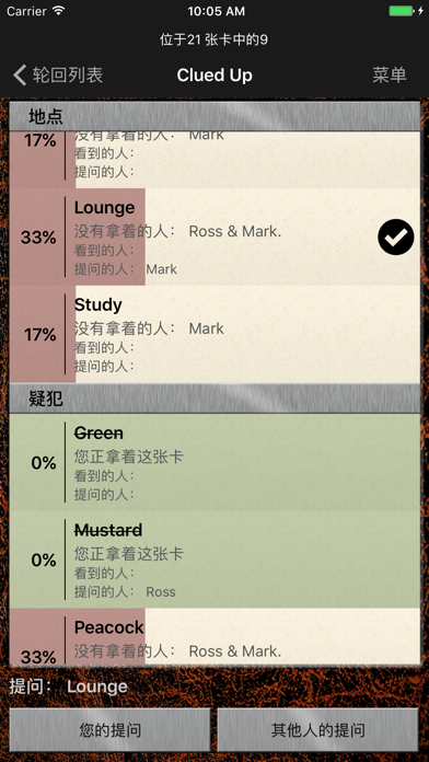 如果您不想让您的对手有任何机会的话Clued Up能够达到超越智能记分卡的效果。如果您启用了自动推断功能,该应用程序将交叉参考所有游戏回合并为您定位卡牌,超越人类能够达到的水平。