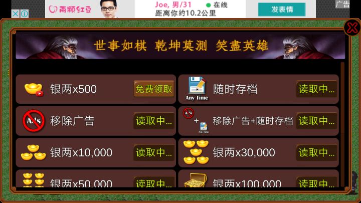此游戏十分折磨人,特意送上本人最强技巧,来解决困惑玩家1~(最新版本我没下,说把巫山派人改回去了,我建议别改,要不对新手太不利会过早放弃游戏)学到任何招式都没用,全是废招,不仅攻击低还大部分打一个还特别废内力,导致一上来各种死,解决办法~~刚开始用免费内购反复刷200金买装备(没几个装备给你买有啥买啥)再买点药混剧情,用不了多久娶第一个老婆,她能免费给你10暗器,有了暗器去成都城外下面空地来回跑