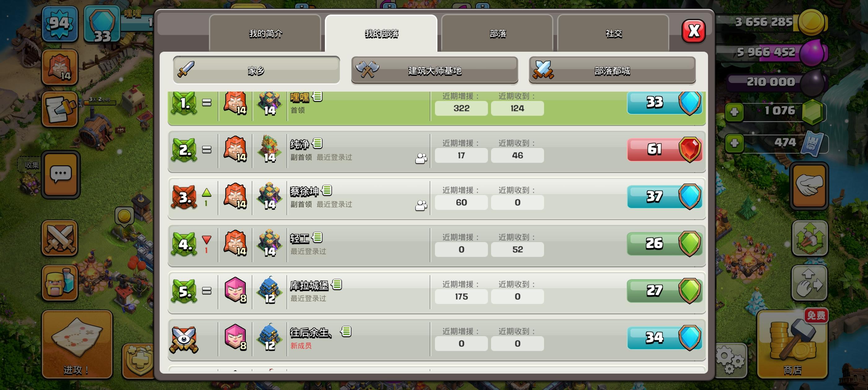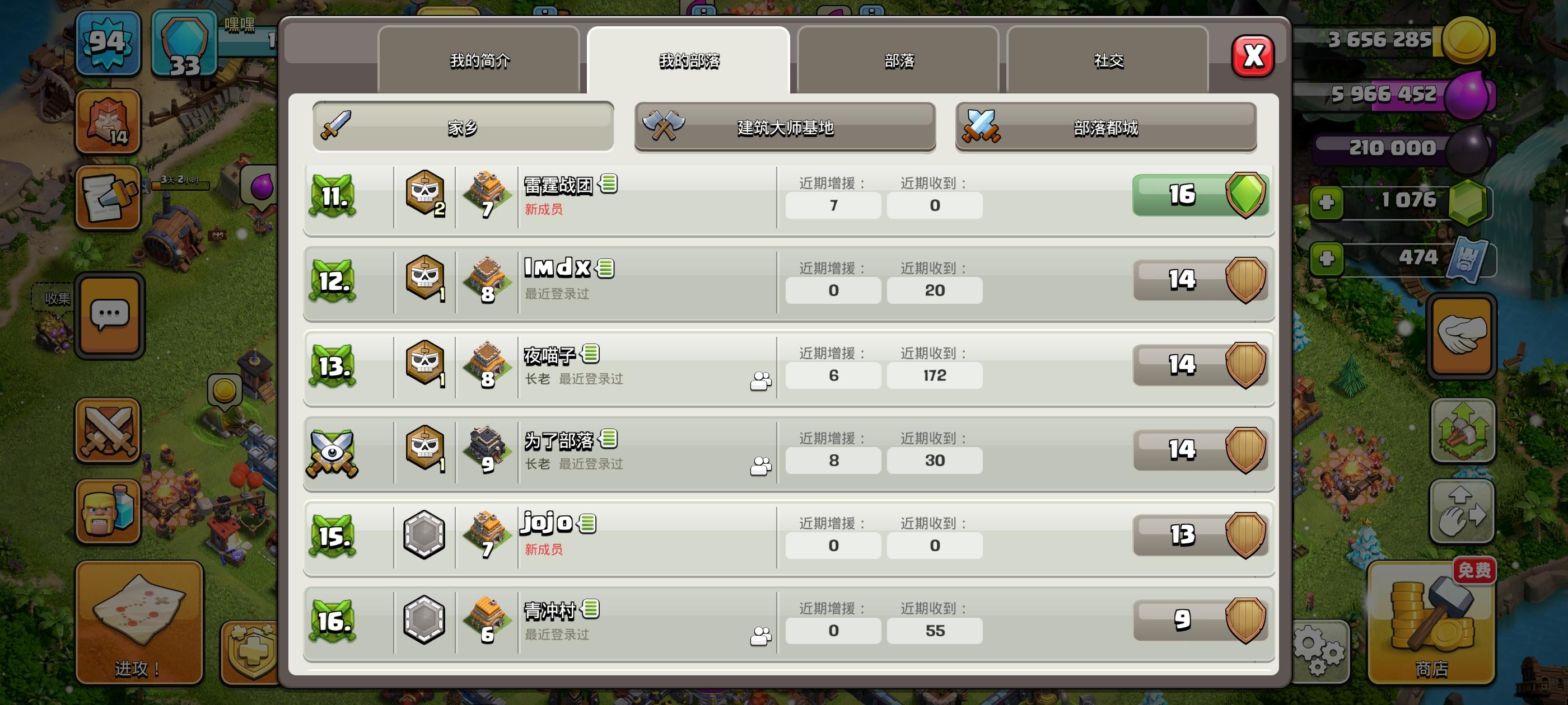 #2Q0YCJC80,新建不到一周的部落,都是刚玩不久的萌新,按活跃度给职位,有群