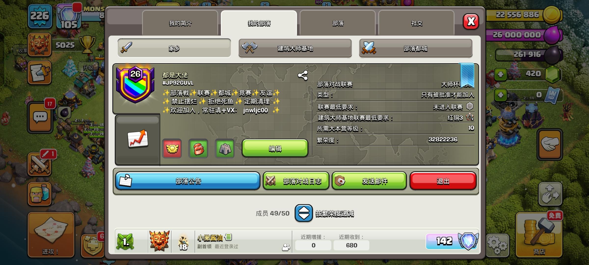 #2Q0YCJC80,新建不到一周的部落,都是刚玩不久的萌新,按活跃度给职位,有群