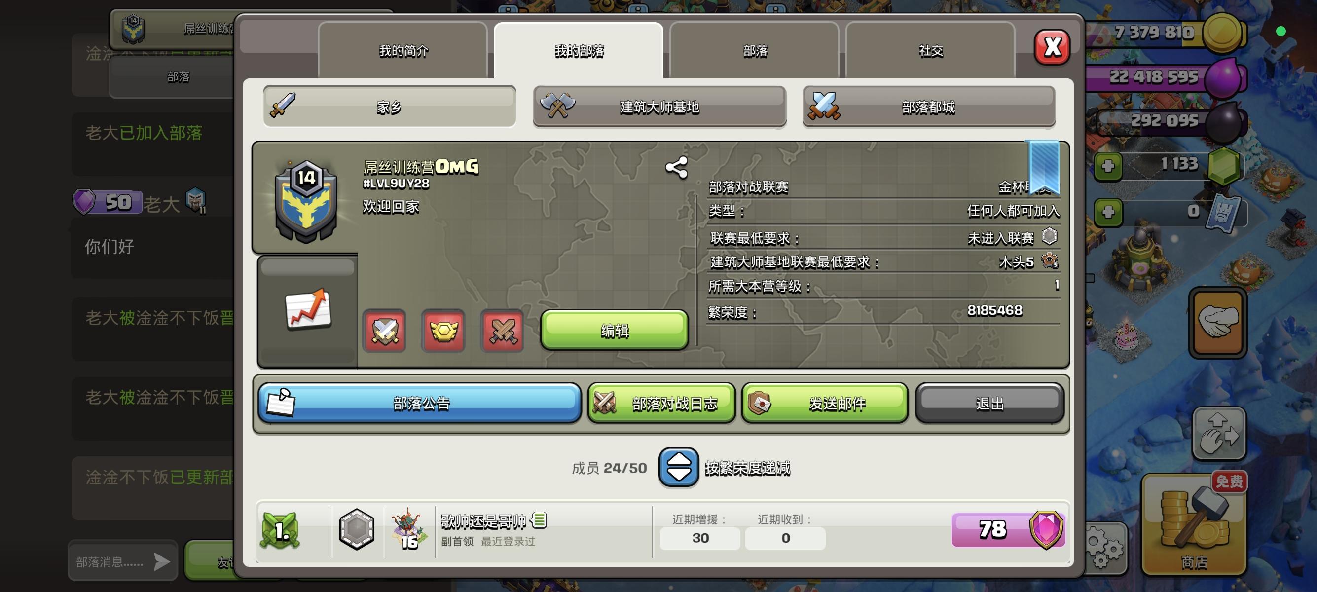 国服22级部落,水晶一联赛,10级都城。部落战连开,按贡献给职位,每周清理不活跃成员