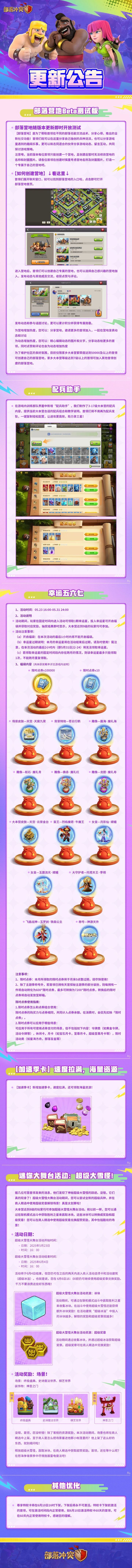 各位首领,部落飞升节即将全面升级!这次飞升节不一般哦!请参与投票来决定您想要的福利吧!您希望—哪种升级资源的费用减免30%?您希望—返场哪个绝版障碍物呢?更多确定内容:胜利之星基础奖励提升50%。飞升节全等级下放:全服首领享有圣水和金矿资源的产出以及容量三倍提升。速速投出您宝贵的一票吧!
