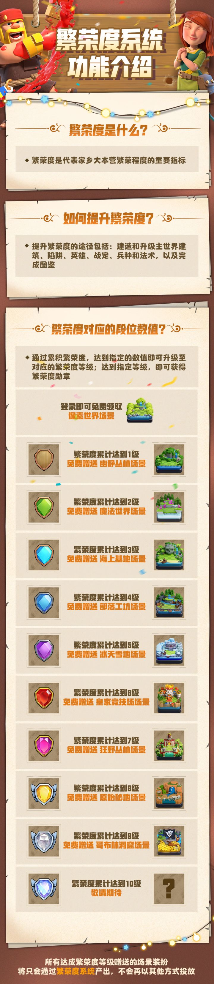 各位首领:我们于8月14日06:00进行了一次维护更新,预计维护时间180分钟,本次更新需要更换客户端。更新后,您将在游戏内体验到全新的「繁荣度」系统,在下午16:00后,游戏将开启「装扮飞升节」,大本营等级达到7级的用户可以进入活动页面免费领取场景装扮,达成对应的繁荣度等级还可免费领取额外的场景装扮。