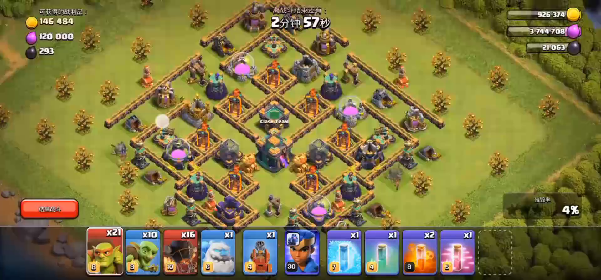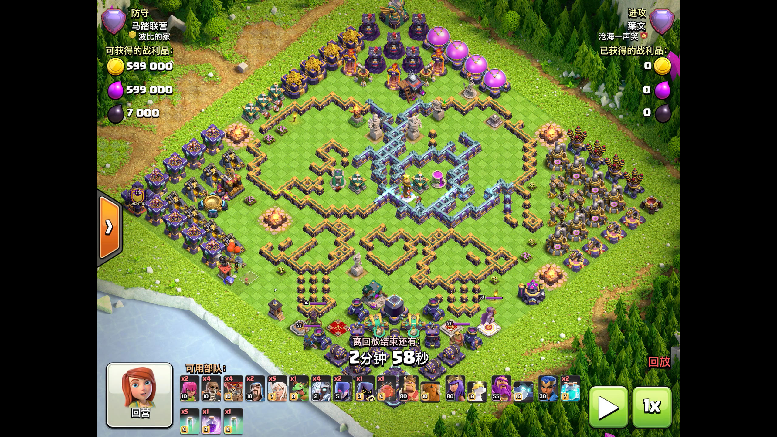 最近刚在国际服流行起来的打法,国服也通用,国服雷龙和国际服等级一样,但部分防御等级低一级,理论上比国际服好打一些才对,适合打防空放四个角的对称格子阵。 开局天女打掉一个防空,然后召回,再打另一个防空,烈焰车帮清一部分防御,雷龙咏王狂暴爆本,尽可能多打一些防御,最后蛮王盾神清场。