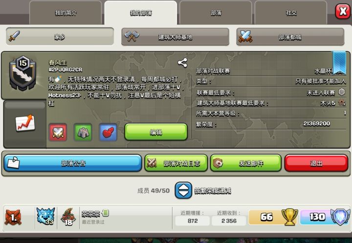 ✪春风生(国服休闲部落) ✪#2PJQRG2CR ✪有🍼,部落战常开,各种活动轻松做满✪希望你活跃、常驻、能+V、联赛听指挥 ✪等级15✪联赛:水晶三✪都城:9级 ✪部落是老部落重建,希望找回以前讨论打法技术,热热闹闹的感觉,现在部落里很活跃,无论你是萌新还是大佬,我们都欢迎你的加入!✪加群+公告🛰️,不能加群勿扰