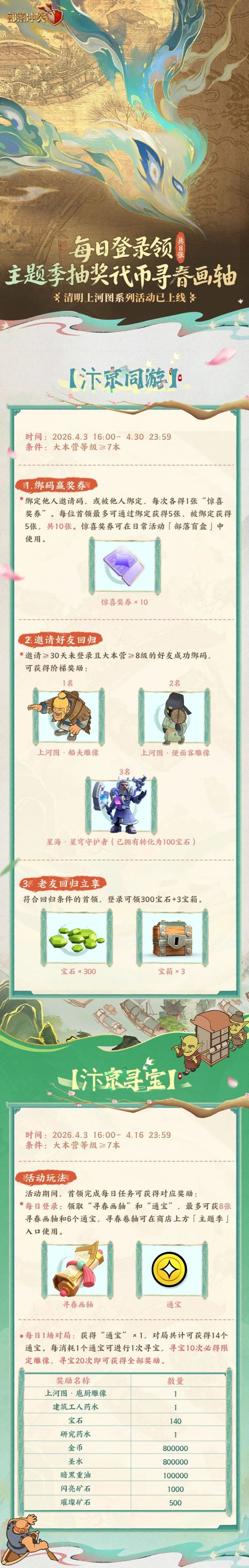 首创特殊天气效果本次主题季首次引入动态天气系统。丝丝春雨伴着桃花瓣簌簌飘落,洒向虹桥、汴水与城楼。雨势随场景微妙变幻,营造“春晓”独有的湿润与温柔。还原市井文化与汴河风貌以《清明上河图》为基底,重构部落基地。场景以汴河两岸与虹桥市井为核心,三段式叙事(市郊田园、虹桥枢纽、城内街市)对应基地成长阶段,移步换景。汴京被设定为部落大陆东方的“繁华贸易王国”,文化风格独特,科技体系介于“东方匠艺,精