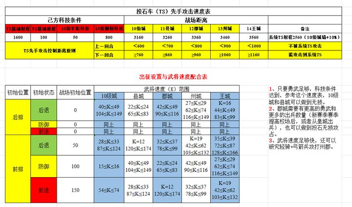 《王者之心》攻城战必须学会合理使用炮灰部队,不能直接上来硬冲,部队损失太大。使用投石车攻打县城及以下城池,合理调配出征站位和武将速度,完全可以做到无损,下面是一个配合的表格,各位萌新玩家务必研究透彻。 前提条件是我方车轮科技和抛射科技都已经满级,这个非常重要,以下的数据都是在此基础上展开的。战场距离那一栏可以看到,10级城--14级王城的战场距离是逐次变大。这里有一个攻守双方的射程差距,攻防在科技