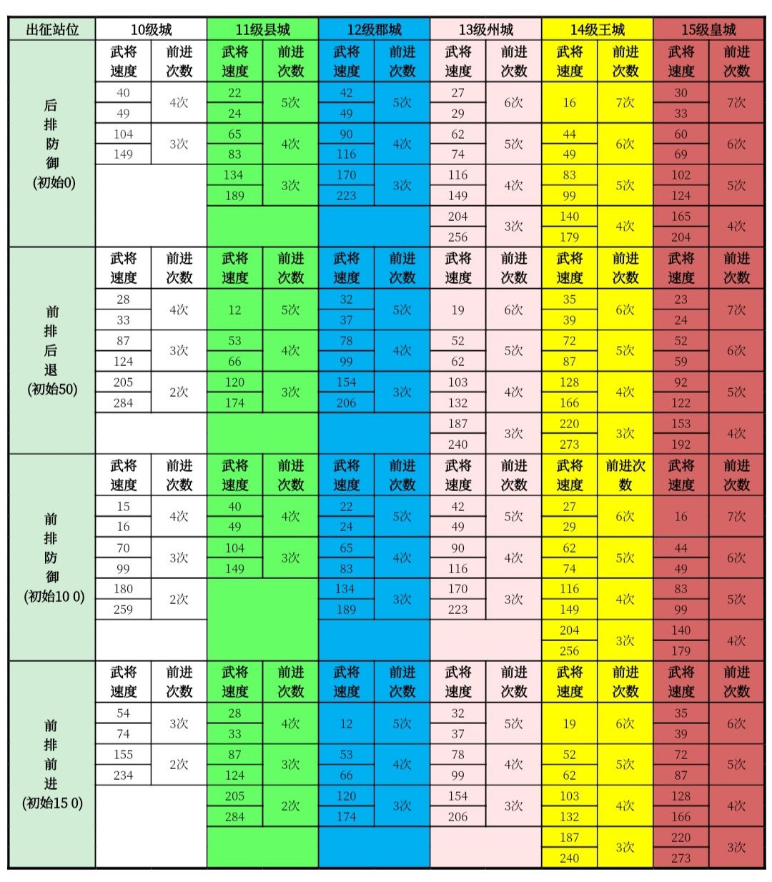《王者之心》攻城战必须学会合理使用炮灰部队,不能直接上来硬冲,部队损失太大。使用投石车攻打县城及以下城池,合理调配出征站位和武将速度,完全可以做到无损,下面是一个配合的表格,各位萌新玩家务必研究透彻。 前提条件是我方车轮科技和抛射科技都已经满级,这个非常重要,以下的数据都是在此基础上展开的。战场距离那一栏可以看到,10级城--14级王城的战场距离是逐次变大。这里有一个攻守双方的射程差距,攻防在科技