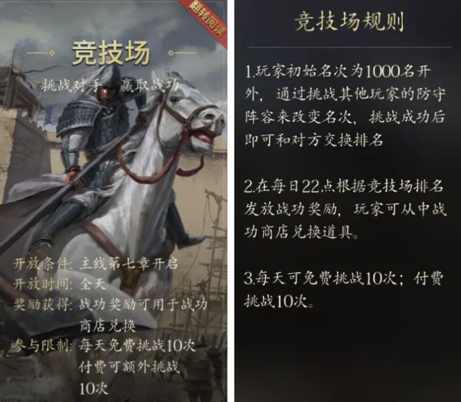 三国题材的SLG手游,向来都十分讲究玩家之间的对抗PK玩法,市井江湖要是没有了打擂台的热闹,就如同菜里没放盐一般。taptap版《军令如山:王者之心》对于竞技场的打造,也是非常花心思的,本期就带着大家详细观摩一番。 当前版本的《军令如山:王者之心》竞技场活动,需要主线任务开启第七章以后才能参与。这道门槛对于普通玩家而言并不高,每天可以打10次,额外增加挑战次数则需要多付门票费。全程并不占用多少时间