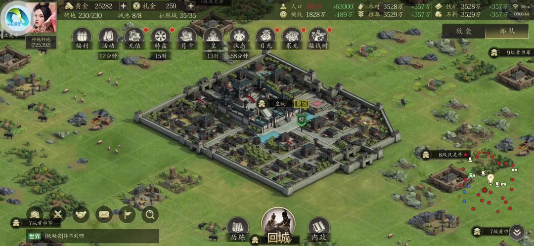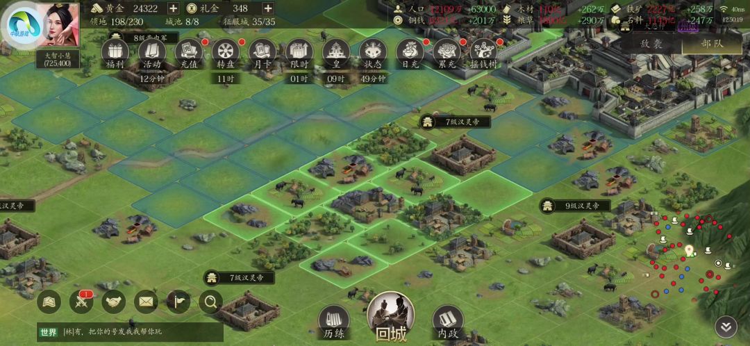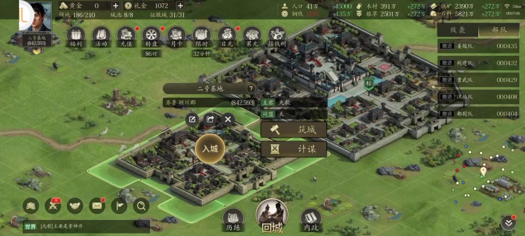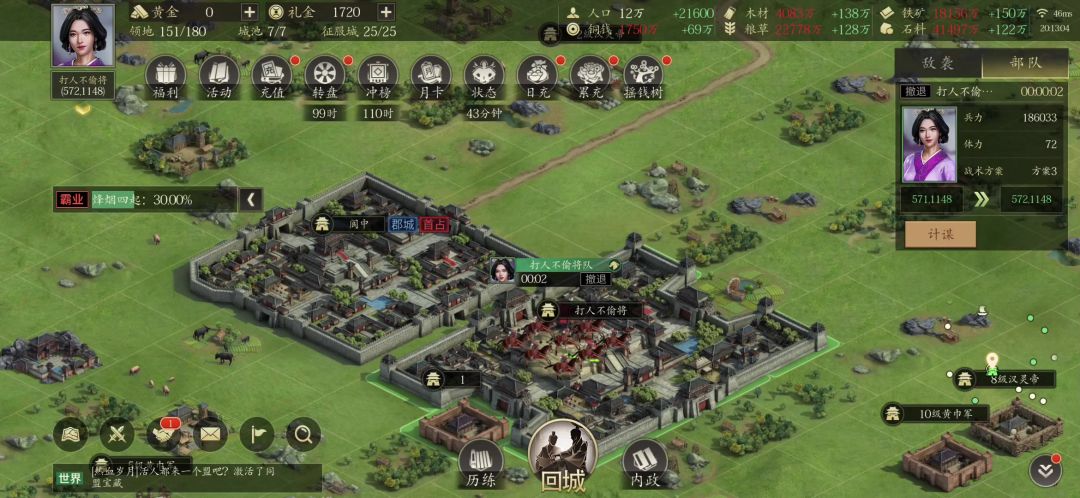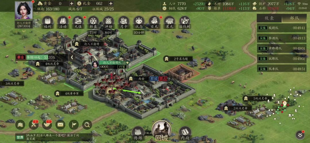 这个游戏主要就学会怎么打郡城,只要会打郡城那后面州城皇城也就会了,套路都一样,我发两个打郡城的视频,第一个是怎么打近战,第二个是怎么打远程。打之前把各种符都吃上,然后打近战选择攻城,打远程选择掠夺,武勇吃符2000左右就够了,打近战速度速度不要太高三四十就够了,打远程的话速度60左右应该差不多了。