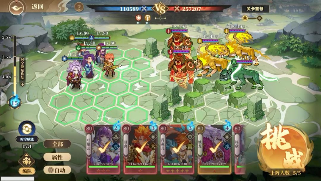 主C:叶紫芸 副C:肖凝儿(可替代) 肉盾:聂离(可替代) 辅助:烛龙(必须6星)、杨欣(可替代) 替代后,注意整体时空能量要在【中】以上。 能量分配思路(手操):可适当先存2个以上的能量球,优先给烛龙分类蓝色能量球打主动技能,使得敌人进入冰冻状态,期间视情况给叶紫芸穿插红蓝球打输出。叶紫芸能量满之后,先不要释放,等敌人进入冰冻状态再释放,因为在烛龙的被动下,我方全体单位对冰冻单位增伤25%! 能