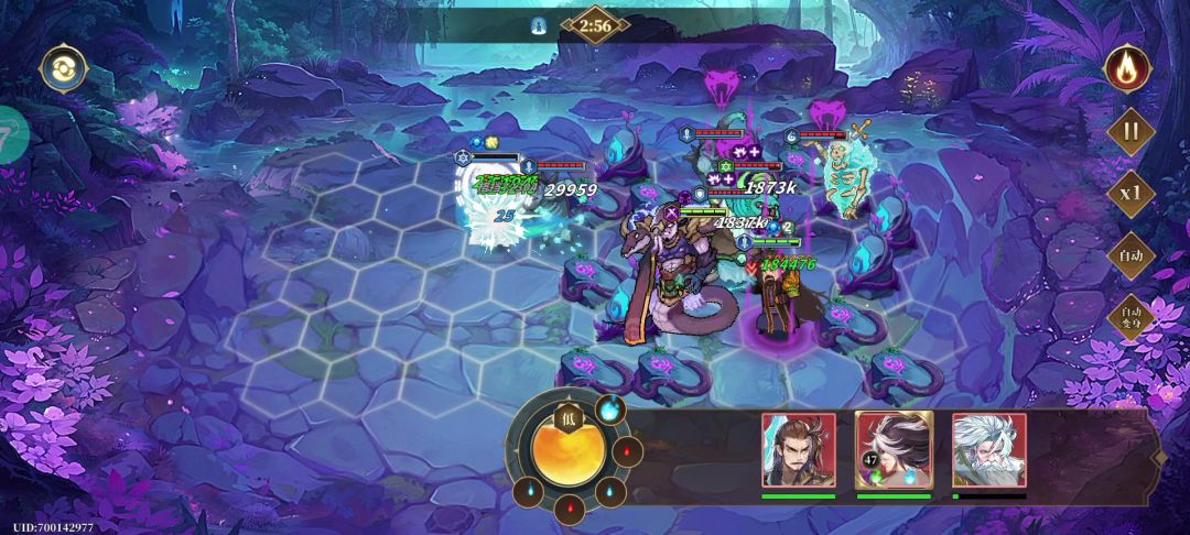 主C:叶紫芸 副C:肖凝儿(可替代) 肉盾:聂离(可替代) 辅助:烛龙(必须6星)、杨欣(可替代) 替代后,注意整体时空能量要在【中】以上。 能量分配思路(手操):可适当先存2个以上的能量球,优先给烛龙分类蓝色能量球打主动技能,使得敌人进入冰冻状态,期间视情况给叶紫芸穿插红蓝球打输出。叶紫芸能量满之后,先不要释放,等敌人进入冰冻状态再释放,因为在烛龙的被动下,我方全体单位对冰冻单位增伤25%! 能