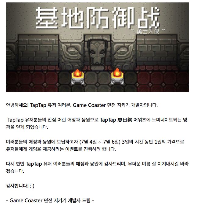 #开发者感谢信#翻译你好!各位TapTap 玩家们。我是《基地防御战:勇士入侵》Game Coaster 开发者。首先 TapTap 玩家们多次支持下《基地防御战》TapTap 夏日祭活动 获得 "精品付费游戏"!为了表达感谢大家的支持和关注!从7月4日 ~7月6日开始限时打折(1元)活动!希望大家来 TapTap 支持正版游戏,再次感谢各位 TapTap 玩家们!:)