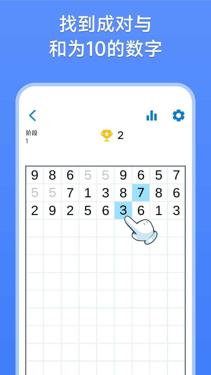 【新版本更新】1.1.4已提交审核,新增支持TapTap登录,让你的战绩永留存!###################数字消除术之加法消除术!※移动你的手指,寻找相加等于10或相同的数字对,然后消除他们※查看不同的方向,数字对可能在水平方向、垂直方向、甚至斜线方向上※查看斜线数字对,寻找有空白单元格隔开的数字对※逐行查看,查看相邻行的首尾端,可能存在数字对※如果没有剩下的数字对,则添