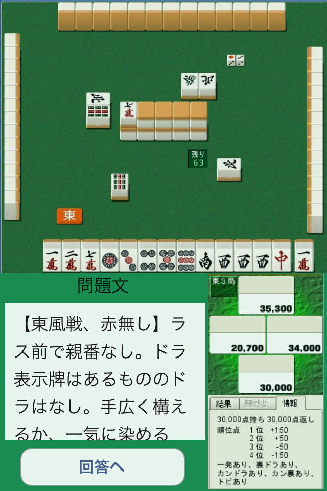 日本プロ麻雀連盟公式オンライン麻雀サイト-ロン2の協力により厳選された50問。設問ごとに異なるルール・細かな場面設定のため、まさに「この場面では何を切る?」という実戦に役立つ何切る問題です。