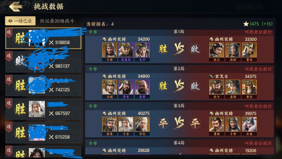 了解到增强队伍战斗力的是属性和科技之后,我们满星紫将就大有可为了。 满星紫将主要属性高出白板橙将300多,橙将至少3星才能追平。 选紫卡也有讲究,张燕=小张飞、张苞=小黄忠、张曼成=小刘备、关平=弱化版张辽还有许多紫卡都可以上 下图是黄忠换张燕(满星张苞更好)、曹操张辽于禁换成于禁张曼成(小刘备)加关平(半个张辽)组合战损变低了。 紫卡加高星橙卡前期(一个月)还是有不错的属性加成。遇到白板橙卡,无