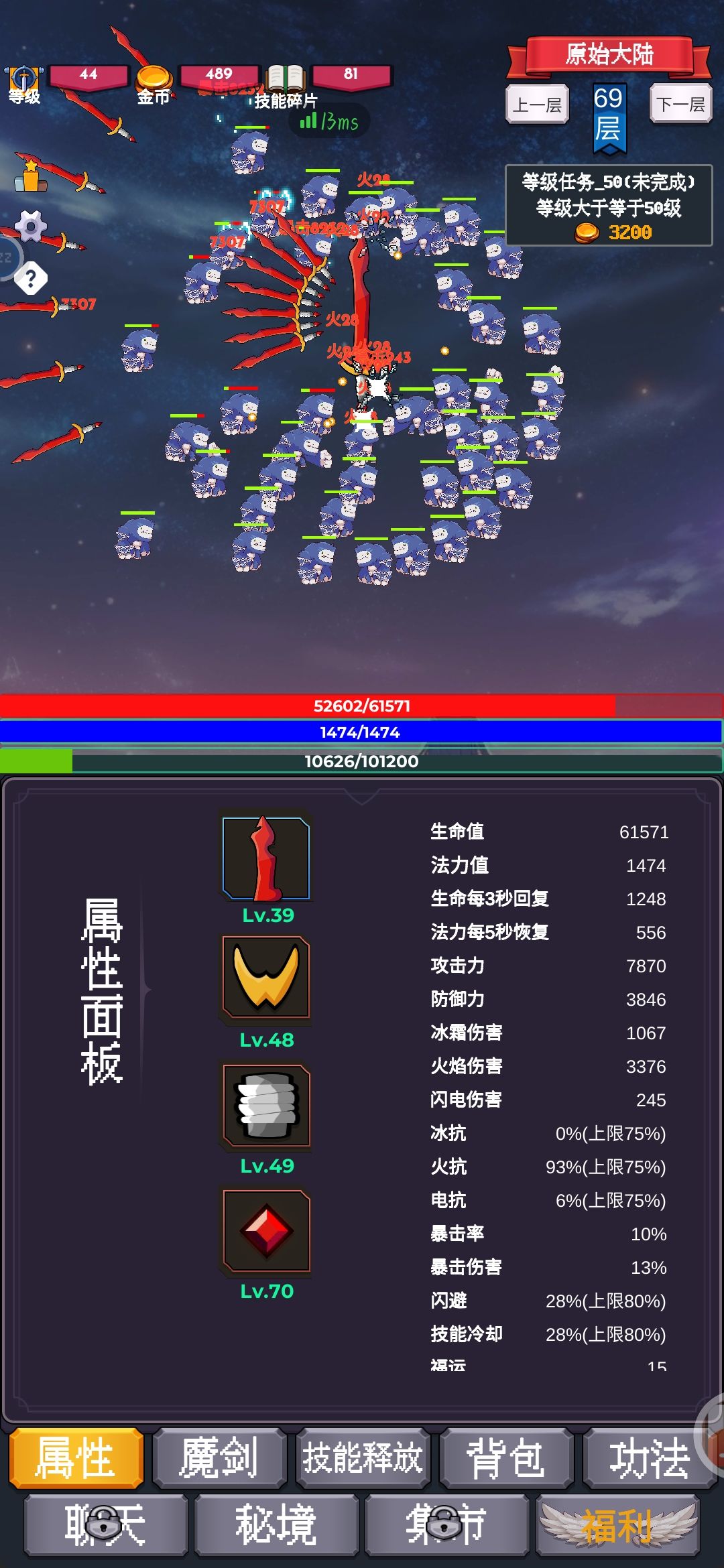 这游戏三个属性 伤害 冰火电, 每5层怪物属性变换一次了,所以没有固定一套装备, 需要你准备三套属性装备支撑。 抗性为主、 其次防御、回血、攻击,, , 技能升级 : 普攻 ,只改变数量 普攻被动 ,打怪时可根据自己属性攻击更改 主动技能 ,等级有点bug,手动 冲关卡 boss专用 功法 , 前期还是以 攻 、防、回血为主 打法 : 每5层怪物属性变换 打人物角色掉血时可以看到前缀有