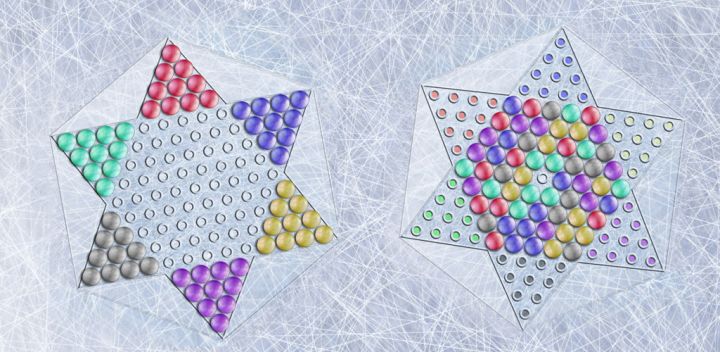 玩法:所有棋子由中央开始放满棋盘(正中央的一格要空出),形成6角形。玩家每次可选任何一枚棋子移动,当一枚棋子跨过另一枚棋子的时候,被跨过的棋子就为「被吃掉」。每次移动一定要吃到棋子,或移动棋子到相邻六格. 当无棋可吃就会自动结束。