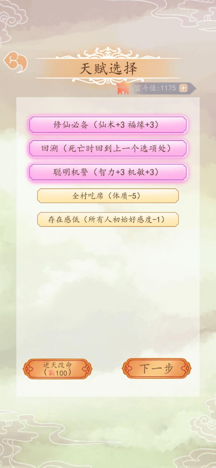 华妃线修仙流开局下图三个必备,有那个幸运儿触发随机事件的就把回溯换成幸运儿。我看了两次广告,基础体质是20,加上点之后的数值是:1+7+10+10+2华妃修仙体质必须要30才能引气入体后期福缘很重要!!!别崩人设,记得刷数值