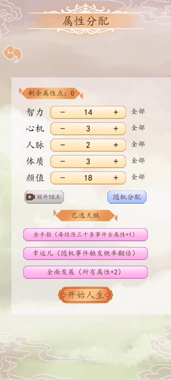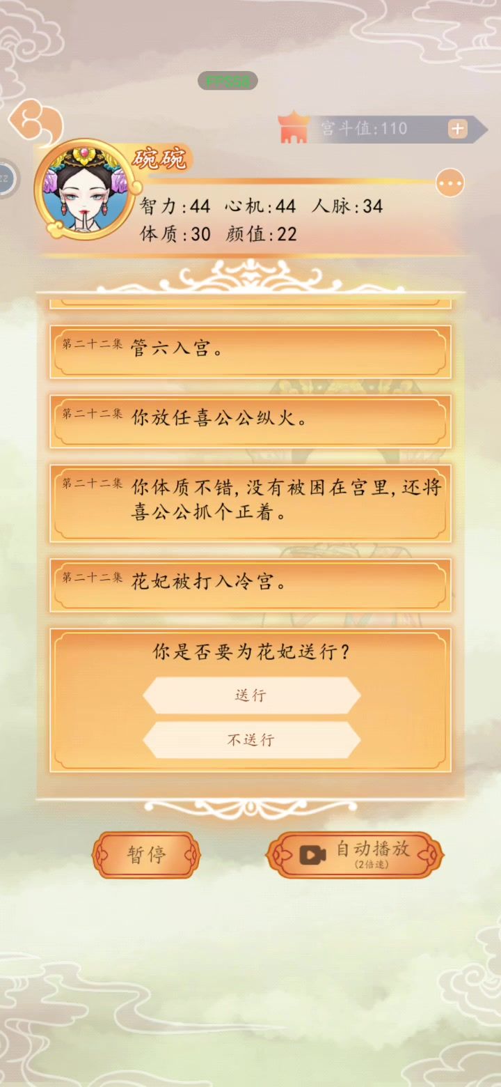 围观一下大神,这么难都能刚到19集!2.0版本已更新,降低了游戏难度,提升了隐藏事件的触发概率,降低了随机事件扣除属性的点数,增加了宫斗值兑换当局属性的功能,欢迎小主更新体验~