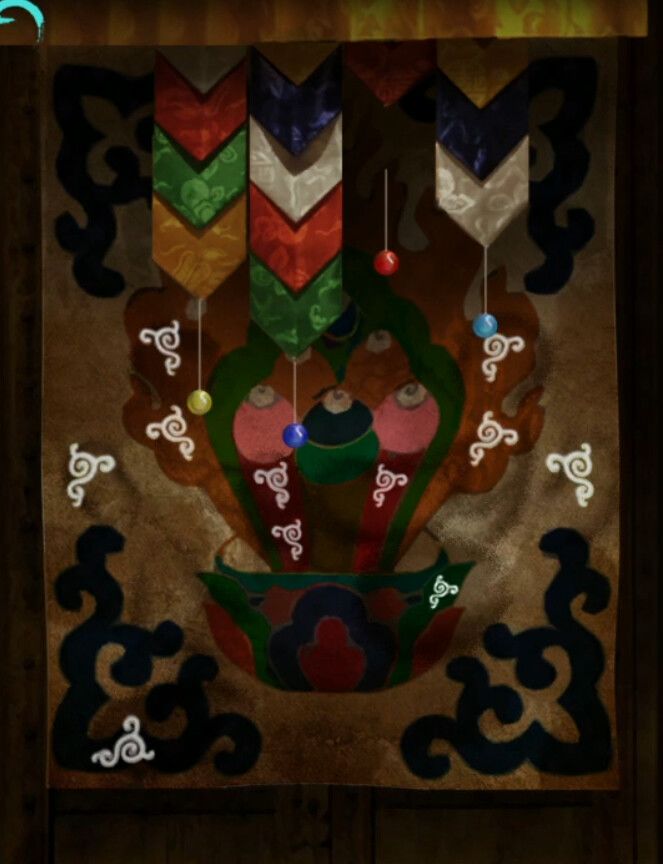 剧情后首先看一下右边墙上的挂画,下面红黄两色参差不齐,和门上红黄相间的绳子应该是有关系的,把低的一端当做是被拉动下来的话记下来顺序为右右左右左右右,然后观察一下上面花朵对应的鬼画符,额这个因为都是一团一团的不好描述,就看图片吧。左边的敲鼓人偶,人偶分为三个,最左边的鼓敲中间位置会依次自动亮起,记下顺序依次为假睫毛-晾衣架-带弯的手-不弯的手-晾衣架-椅子-鱼钩,然后结合上图换算成花朵图案,在右边