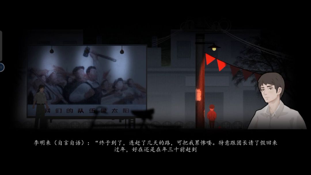 个人游玩感受:李明已经死在了战场上,但是因为自己本身对家人的思念和家人(大伯和妻子)对其的思念透过一些仪式造就了阴阳街的存在,而男主也就存在于现实与虚幻中,所以他能看到一些已故之人的身影,也能与真实世界的人交谈。本作另一条线是老刘的邪恶仪式导致的拐卖妇女儿童,妻子就是深爱李明所以才上了老刘的当而失踪。后续应该李明通过一系列解密救出妻子与无辜的人,最后意识到自己已经故去,与妻子在一片黑暗诡谲的世界中化作一道光散去,世界也因此恢复了色彩,因为李明而存在的阴阳街也消失了。