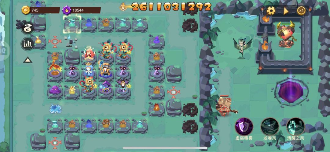 三周目3-60 BOSS站位 站一起集火就完事了… 左上角那个天使是测试沉默会不会回血 结果无效 然后改这个站位忘记放回去,没天使都能打死回血BOSS