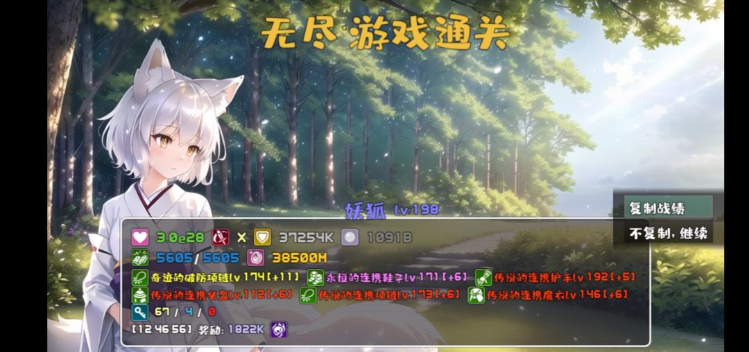 游戏种子:[35372166] 初始奖励等级:14 亡灵术士 ----区域2--- 00:20:19 血量:1148/攻击:41 防御:29/魔防:62 金币:823/等级:10 装备:冰刃/未解锁/未解锁 未解锁/未解锁/未解锁 钥匙:0/1/1 ----区域3--- 01:01:22 血量:2610/攻击:91 防御:123/魔防:70 金币:2096/等级:16 装备:冰刃/蒸汽戒指【Ex】/木盾【防15】 未解锁/未解锁/未解锁 钥匙:0/2/1 ----区域4--- 01:32:34 血量:146004/攻击:709 防御:246/魔防:253 金币:8228/等级:25 装备:冰刃/蒸汽戒指【Ex】/亡灵之刃 帽子lv.1 /未解锁/未解锁 钥匙:9/2/1 ----区域5--- 01:49:48 血量:600294/攻击:2170 防御:334/魔防:395 金币:8951/等级:29 装备:冰刃/蒸汽戒指【Ex】/亡灵之刃 砍刀【攻50】/未装备/未解锁 钥匙:7/2/1 ----游戏通关--- 02:12:34 血量:1109520/攻击:30726 防御:546/魔防:627 金币:20623/等级:37 装备:冰刃/蒸汽戒指【Ex】/亡灵之刃 电闪雷鸣/正义铁锤/帽子lv.1 钥匙:9/2/1