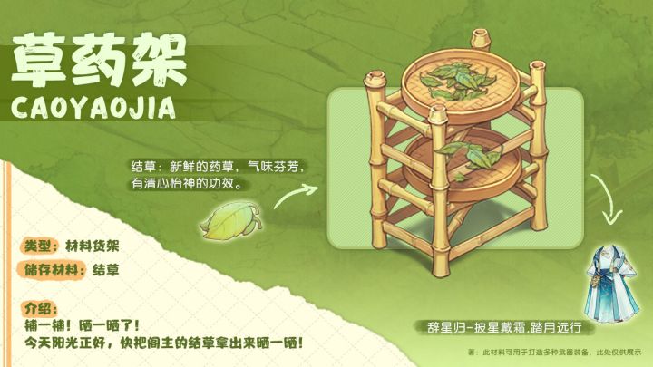 嘿!难得今天是个好天气!快把阁主收集的结草拿出来晒一晒!草药架的用处可是很多,除了可以存储材料外,还能......⌈我怎么会用来放杂物,晾衣服!当然不会!阁主,你相信我,苒苒当然不会做这种事情,都是小荆干的!⌋预约了嘛?关注了嘛?记得前往主页预约关注哦~期待与各位阁主早日相见,重铸剑阁荣光!▷▷▷更多福利欢迎关注● 官方公众号:铸剑阁● 官方小红书:https://ww