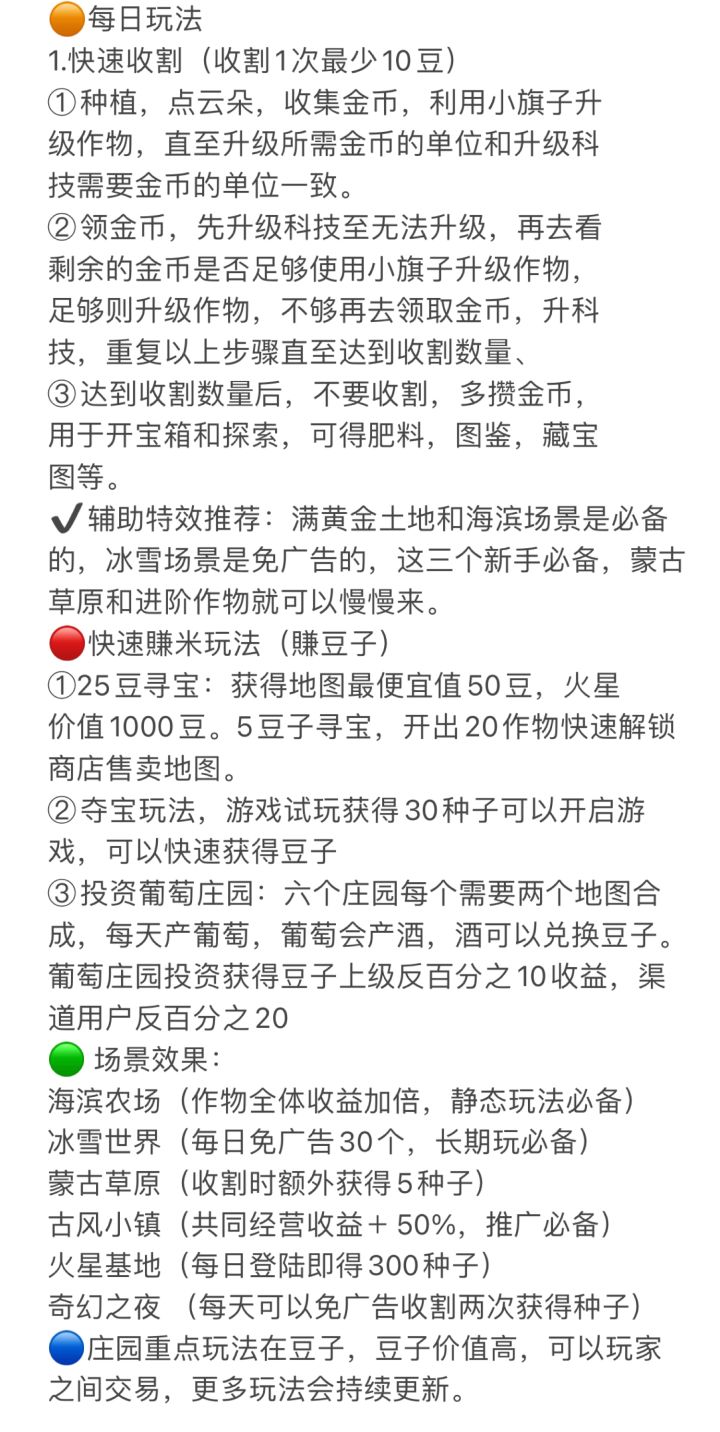 先第一时间先搞冰雪世界场景,大概300个豆子就能搞到冰雪世界场景了,有了冰雪世界场景每天都不用看广告了,直接免30个广告。然后利用这30个广告赚金币。广告主要都利用在领金币与下雨上面即可。然后再结合上面的金币用法操作即可。然后再升级土