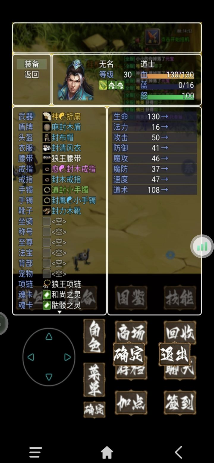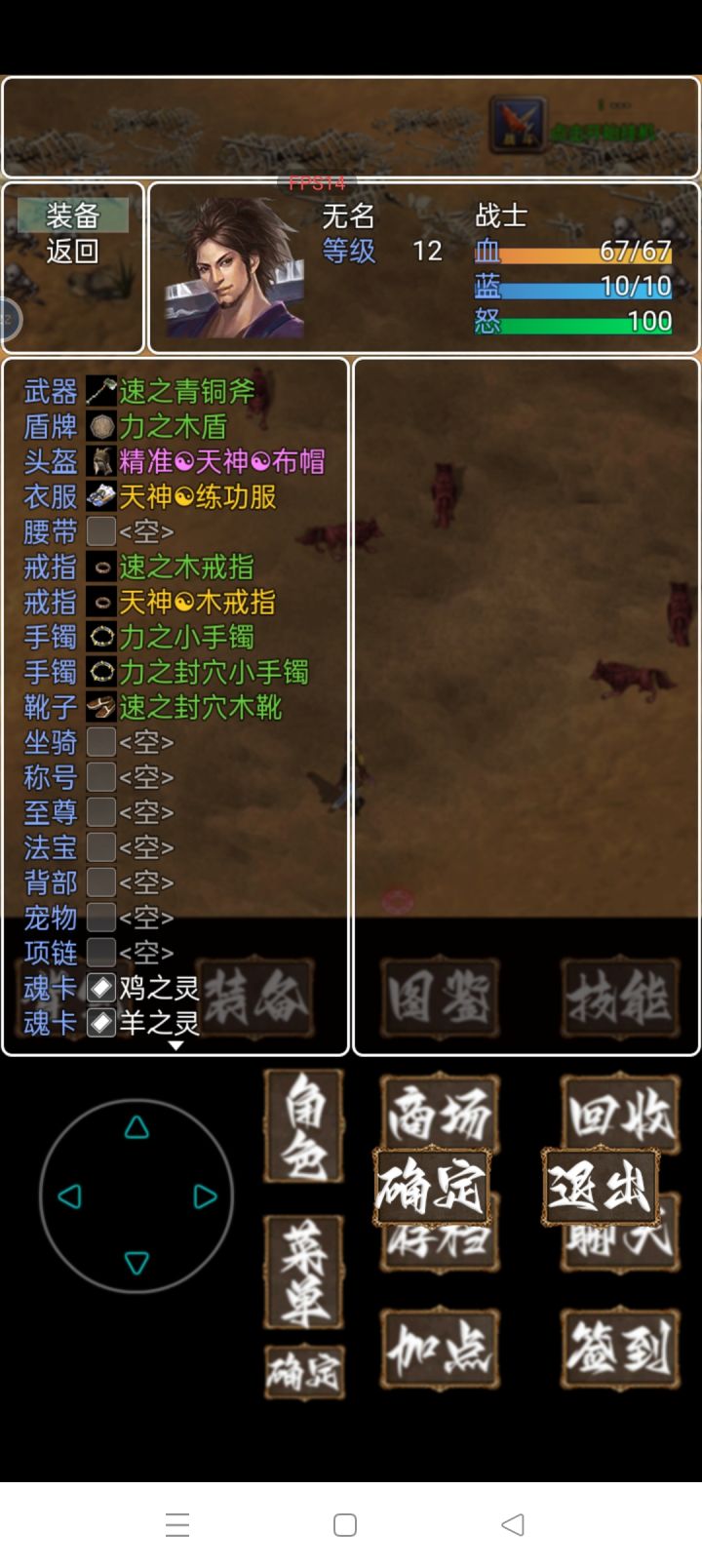 单机版装备爆率感人,挂机300鸡,300稻草人,拿了两称号成就。5,6个小时就掉了4件装备。升级加点加防御和魔防,不然后面根本打不了。对了,开局不停的刷的三个袋子把鸡鹿羊三个灵刷出来,好歹弄个羁绊回2血1魔。我11级就只过了新手村,把张宝救了。第二村子的怪我顶不住……