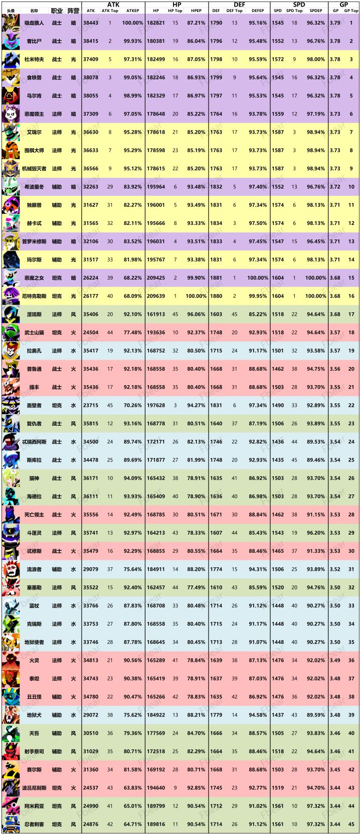 先简单的介绍一下游戏中英雄的分类和克制关系: 游戏中的五个阵营分别是水系、火系、风系、光系和暗系; 克制关系:水系克制火系,火系克制风系,风系又克制水系,而光、暗两系是互相克制状态 5系当中光、暗系英雄要强力一些,所以英雄升星时不要用光暗系英雄作为材料卡。 每个阵营中的英雄又分为4种职业分别是:坦克、战士、法师和辅助。 坦克职业 加强的主要属性有:血量、防御、免伤,坦克职业的主要任务是抗伤害和