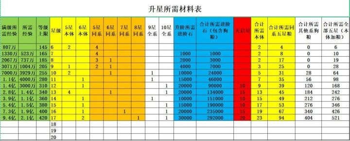 《攻略》升星消耗表格,与精抽顺序