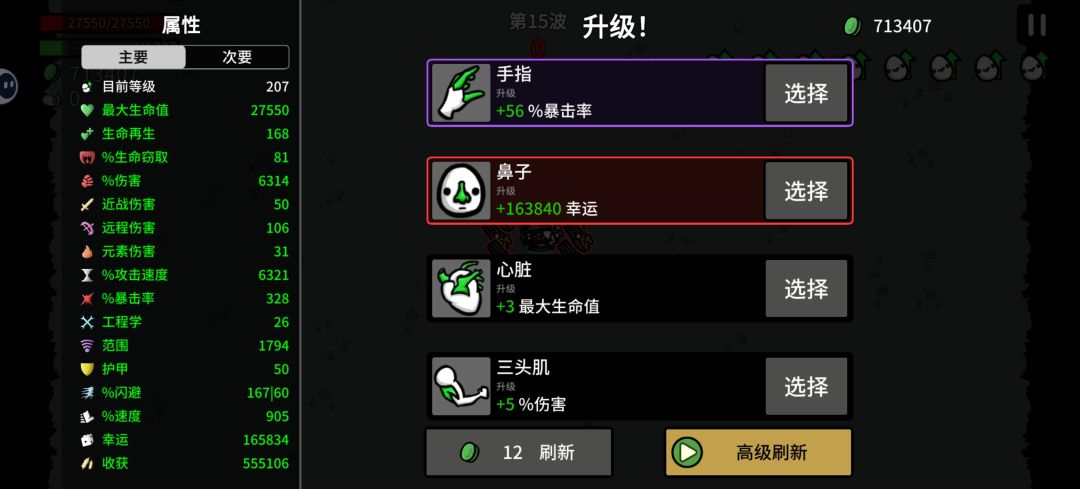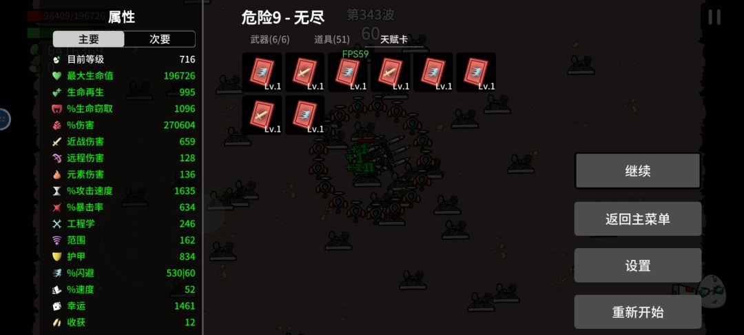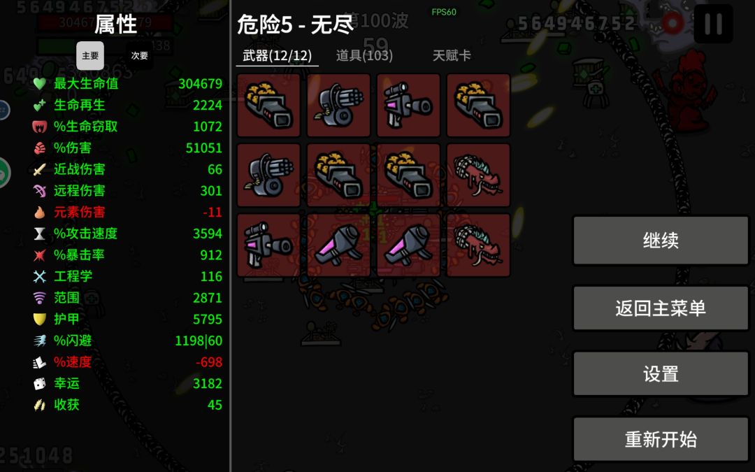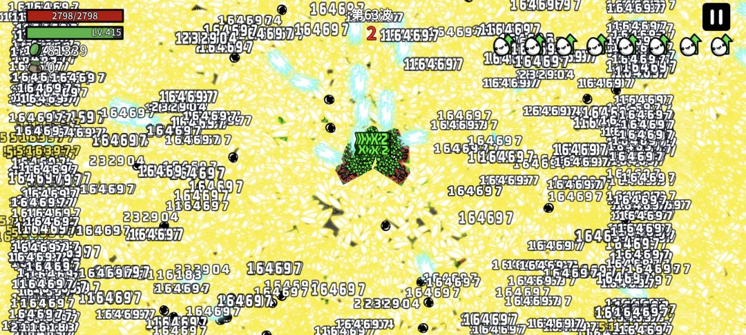 渔夫开局,没有修改数据,也没有用广告功能。60多波,太卡了是这个玩法的上限。主武器毁灭者伤害500多万(图片黄色暴击字体),0.1冷却。图片的黄色子弹是长胡须的婴儿,这个流派的核心。伤害每发16万,怪多的时候大概有上万发。每波收益大概9-10万材料。 冲锋枪出门,前期升级天赋优先收获,副幸运。10波之前,除了拿6把枪,和红色道具,其他全刷新拿诱饵。10波后拿跳弹(核心),长胡须的婴儿(核心),还有