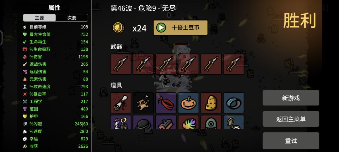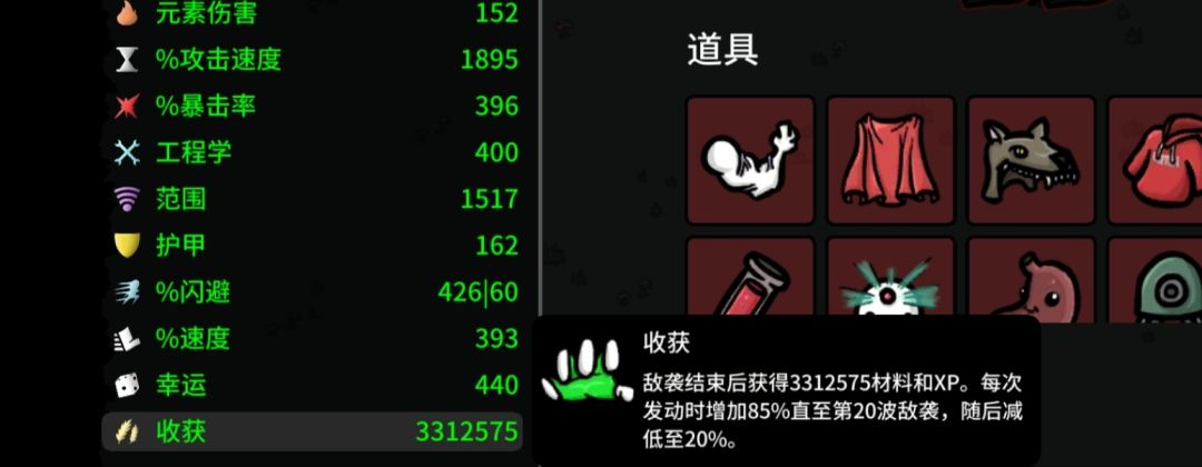 新玩的多面手100波数值 讲讲怎么玩好无尽模式 首先需要随意几张收获卡,最开始在保证能杀怪的基础上点一切能点的关于收获的,到你能点的收获对收获总量改变不大的情况下全点幸运,清怪从来不是问题,有钱了那些普通的加些基础数值的全不要,确定是全都不要,一直刷新多拿那些能堆叠的(树叶,血手,戒指,铁砧,护垫,狩猎)和加经验的,其他比较好的也能拿,注意发电机不能买,买了减伤害 20波过后收获开始减少,注意观察